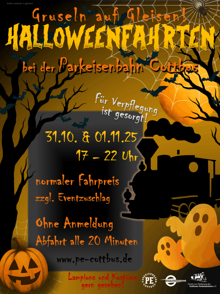 Zwischen Hexen, Geistern und Zauberern lädt die Parkeisenbahn zu den traditionellen Halloweenfahrten ein. Begleitet werden unsere beleuchteten Sonderzüge von so manchen gruseligen Gestalten. Für Spiel und Spaß, Verpflegung und gruselige Stimmung wird gesorgt.